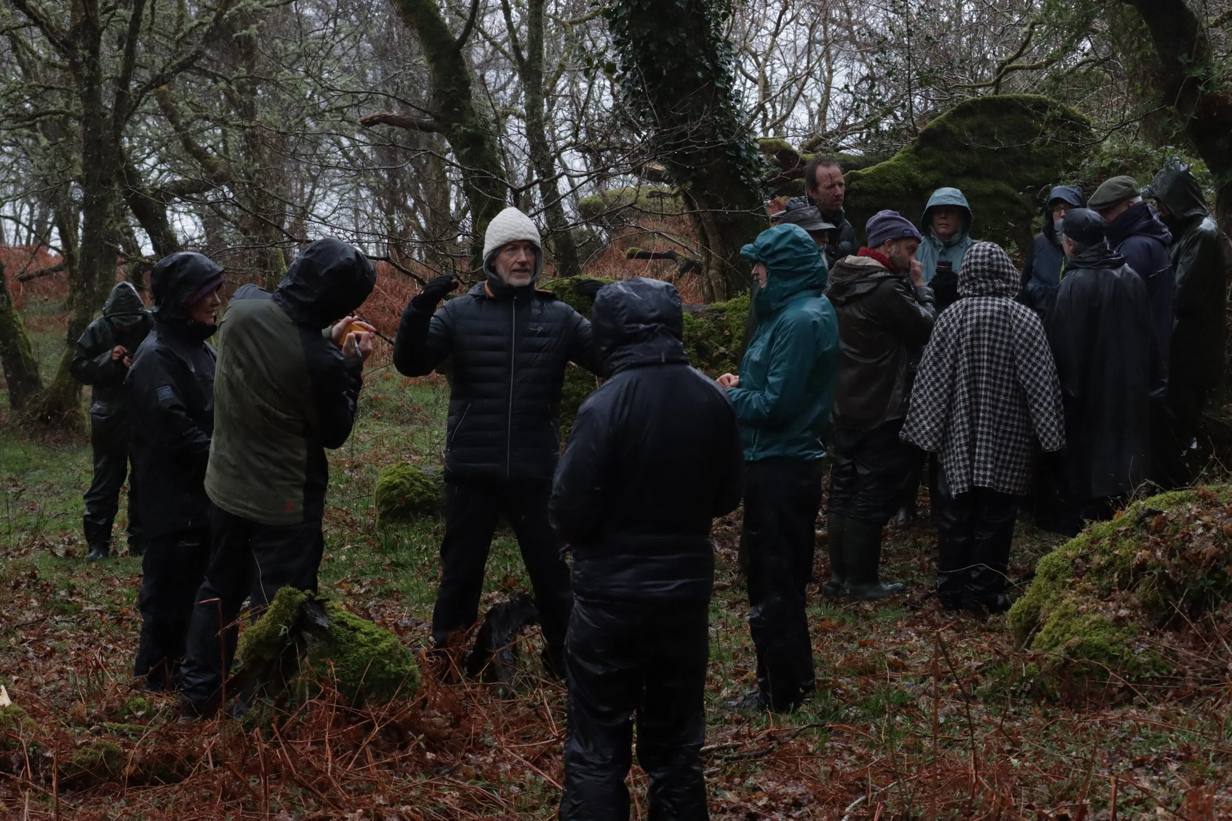 . . we looked around at the present-day community who had donned their waterproofs and shrugged off the cold to be here today as part of this event. Glenan Wood, as of 2019, is community owned, with local people forming the board of directors and events like this organised specifically to encourage the wider community to be involved. Throughout the event, Hannah led the group in some mindfulness exercises, speaking about the astounding age of the rock, and rarity of the lichens and liverworts that dotted the diverse array of tree life. Once we had taken the time to fully appreciate the specialness of where we stood, and the forces of deep time and environmental momentum which had allowed the ecology here to flourish, Rhyddian stepped in to tell us of the small community of Glenan Village which had existed in coexistence with the rainforest before eventually being abandoned at the turn of the 20th Century.